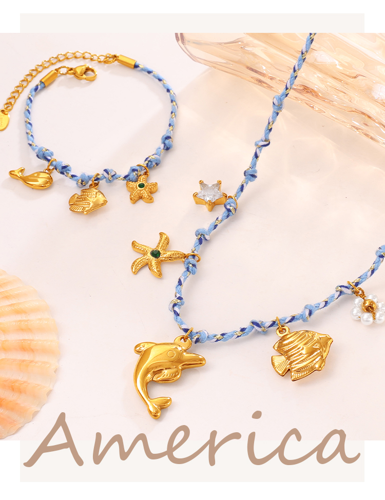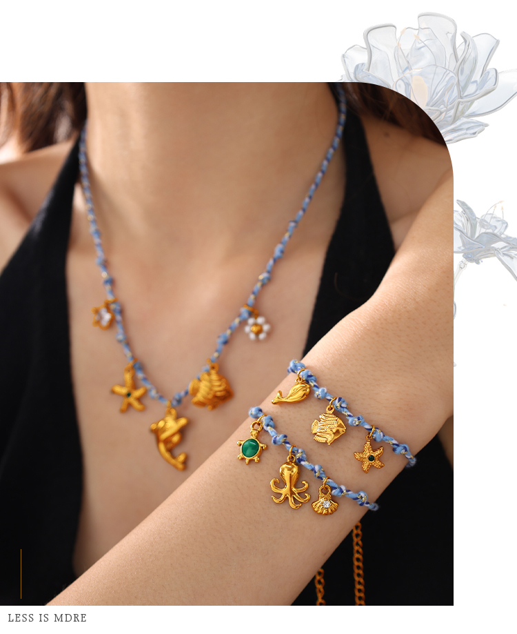 Blue Rope Braided Ocean-themed Pendant Set, Featuring Starfish, Dolphins, And Sea Turtles, Multi-dangling Necklace And Bracelet.